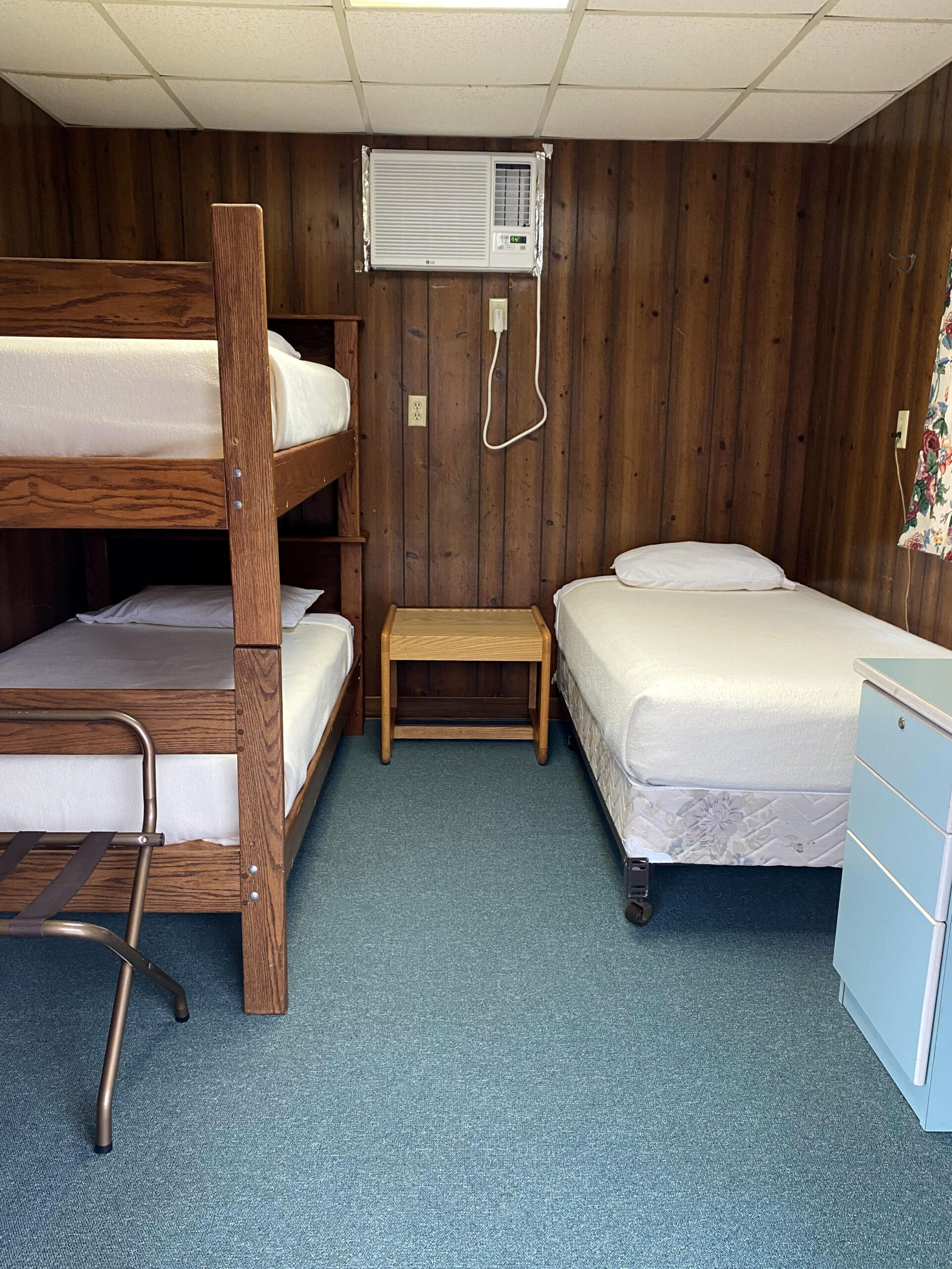 These cozy, air-conditioned cabins hold three (3) twin beds: one bunk and a single. You have access to the Pine Lodge for a common area, kitchenette (refrigerator, microwave, coffee maker, and sink; please note there is no stove) and bathrooms.
